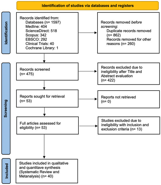 A total of 1597 studies were reviewed through databases and registries. After removing duplicate studies, the remaining records were assessed for eligibility according to the inclusion and exclusion criteria, as shown in the flow chart (Figure 1). The search concluded with a total of 50 articles being reviewed at full-text level. A total of 13 articles were excluded for different reasons [52,53,54,55,56,57,58,59,60,61,62,63,64]. The final qualitative and quantitative synthesis included 40 original studies with a total of population of 7704 ALL patients and 10,825 control participants [65,66,67,68,69,70,71,72,73,74,75,76,77,78,79,80,81,82,83,84,85,86,87,88,89,90,91,92,93,94,95,96,97,98,99,100,101,102,103,104] (Table S2 in Supplementary Materials).