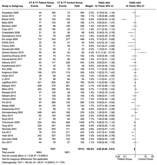 Forest plot of the correlation of T allele sequences (CT and TT variations) of the 677C>T polymorphism of the MTHFR gene in children and adolescents with ALL versus a healthy population. Each individual study is portrayed by a box (effect estimate) and a horizontal line (length of confidence interval) in the right column. The diamond shows the pooled result [65,66,67,68,69,70,71,72,73,74,75,76,77,78,79,80,81,82,83,84,85,86,87,88,89,90,91,92,93,94,95,96,97,98,99,100,101,102,103,104].