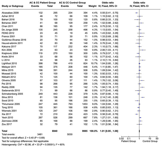 Additionally, children and adolescents with ALL and the C allele sequences (AC and CC) of the 1298A>C polymorphism of the MTHFR gene did not present a statistically significant difference in their frequency compared to that in a healthy population (OR: 1.01; CI: 0.95–1.08; p = 0.69) (Figure 3).