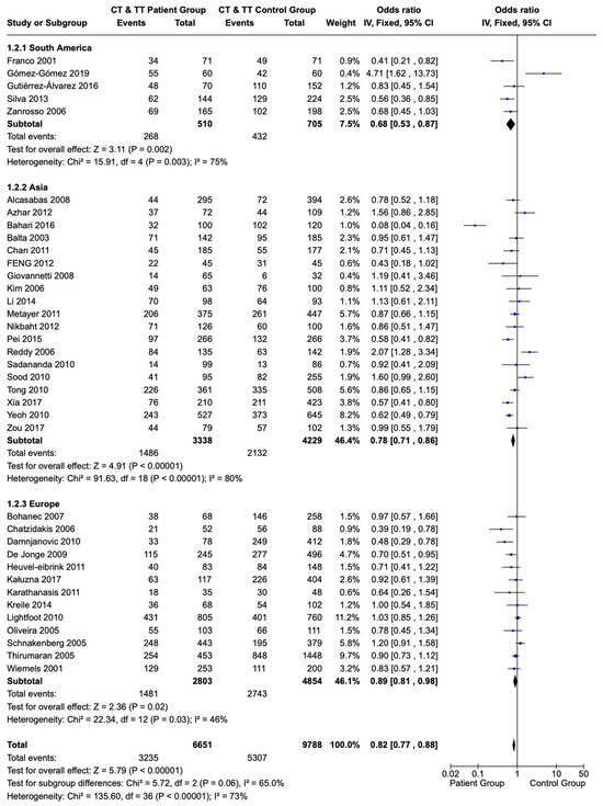 A subgroup analysis of the 677C>T polymorphism showed results consistent with the analysis of the entire group. Children and adolescents with ALL originating from South American countries had T allele sequences (CT and TT) of the 677C>T polymorphism of the MTHFR gene less frequently compared with a healthy population of the same origin (OR: 0.68; CI: 0.53–0.87; p = 0.002). Similar results were also observed in children and adolescents originating from Asia and Europe (OR: 0.78; CI: 0.71–0.86; and p < 0.00001 and OR: 0.89; CI: 0.81–0.98; and p = 0.02, respectively) (Figure 4).