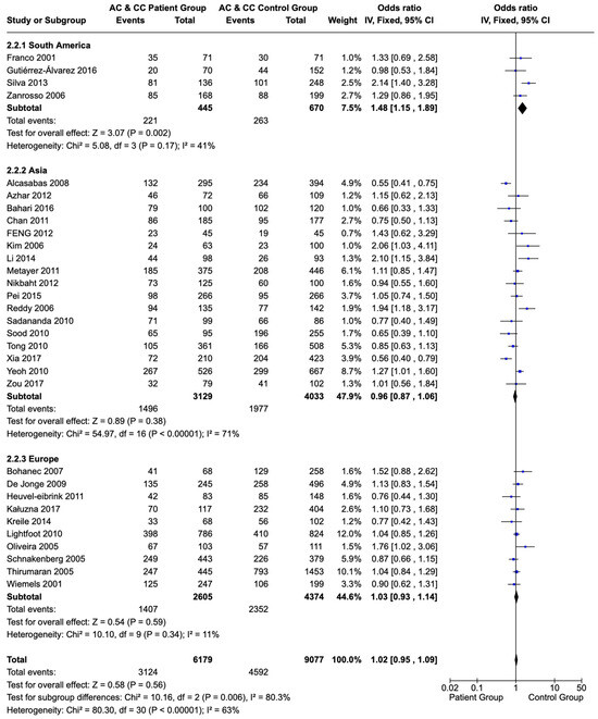 Forest plot and subgroup analysis of the correlation of C allele sequences (AC and CC variations) of the 1298A>C polymorphism of the MTHFR gene in children and adolescents with ALL versus a healthy population based on the population’s origin. Each individual study is portrayed by a box (effect estimate) and a horizontal line (length of confidence interval) in the right column. The diamond shows the pooled result [65,66,67,68,69,70,71,72,73,74,75,76,77,78,79,80,81,82,84,85,86,87,90,91,92,93,94,95,96,97,98,99,100,101,102,103,104].