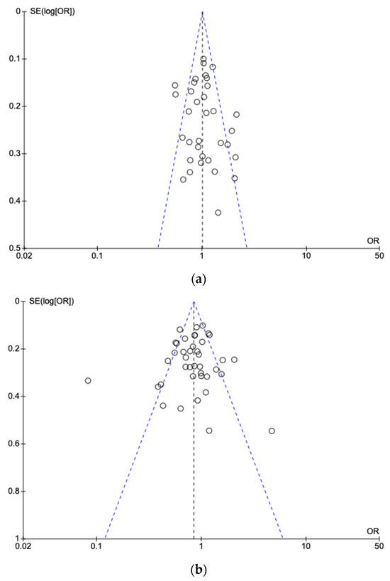 Funnel plot for the assessment of publication bias for the correlation of (a) T allele sequences (CT and TT variations) of the 677C>T polymorphism of the MTHFR gene in children and adolescents with ALL versus a healthy population and (b) C allele sequences (AC and CC variations) of the 1298A>C polymorphism of the MTHFR gene in children and adolescents with ALL versus a healthy population. Individual studies are represented by circles, the blue diagonal dashed lines represent the confidence interval 95%, while the black vertical dashed line represents the overall effect.