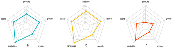 Two partial DQs were statistically reduced compared to the 100 value: the mean posture DQ score, which was 96.2 ± 8.9 * (p < 0.001), and the mean sociability DQ score, which was 94 ± 9.6 (p < 0.001). Table 3 shows the main results of the developmental scale.
