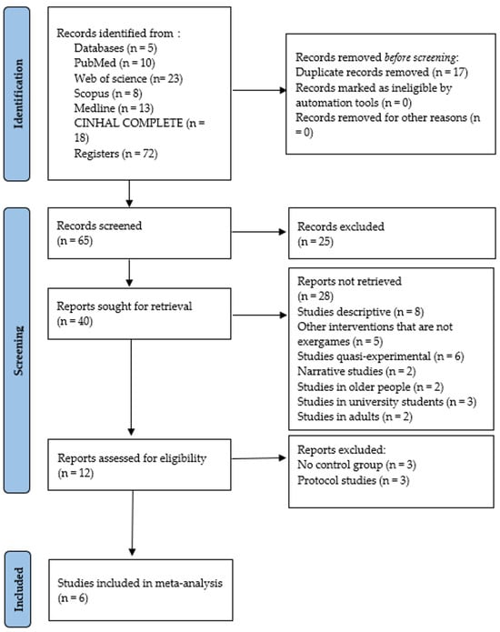 Figure 1 details the search process for the studies. A total of 72 records were found. Subsequently, duplicates were eliminated, and the studies were filtered by selecting the title, abstract, and keywords, resulting in 65 references. In the subsequent analysis phase, 25 articles were excluded because the texts did not meet the search criteria, leaving 40. Subsequently, 28 were excluded: 8 descriptive studies, 5 other types of interventions other than EXG, 6 quasi-experimental studies, 2 narrative studies, 2 studies in older people, 3 studies in university students, and 2 studies in adults. After this process, 12 potential studies remained, of which 3 were excluded because they did not have a CG and 3 protocol studies; 6 studies met all the selection criteria [,,,,,].