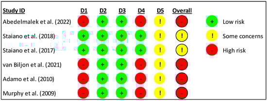 Risk of bias within studies. Legends: D1: randomization process; D2: deviations from the intended interventions; D3: missing outcome data; D4: measurement of the outcome; D5: selection of the reported result.