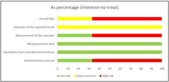 A third researcher (EVC) examined the findings after two independent researchers (JPC and JHM) assessed the included studies’ risk of bias version 2 (RoB 2). This review was based on the guidelines for RCTs in the Cochrane Handbook for Systematic Reviews of Interventions []. The risk of bias was classified as “high,” “low,” or “some concerns” depending on the randomization process, deviations from the planned interventions, missing outcome data, outcome evaluation, and the choice of the reported result.