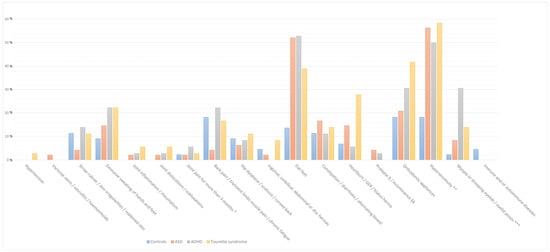 The analysis presented in Table 1 demonstrates that flat feet are significantly more prevalent among individuals with ASD (52.1%), ADHD (52.8%), and TS (38.9%) compared to the control group (13.6%), indicating a strong association with the NDDs under investigation. Heartburn, gastro-oesophageal reflux, and hiatus hernia are notably more frequent in individuals with TS (27.8%) relative to the other groups. Similarly, the use of orthodontic appliances is more common in subjects with TS (41.7%) compared to the other cohorts. Hypersensitivity is markedly more prevalent in individuals with ASD (56.3%), ADHD (50.0%), and TS (58.3%) compared to controls (18.2%), further supporting the existence of a strong correlation with the NDDs included in the study. Additionally, myopia and ptosis are observed more frequently in individuals with ADHD (30.6%) compared to the other groups (Table 1, Figure 1).