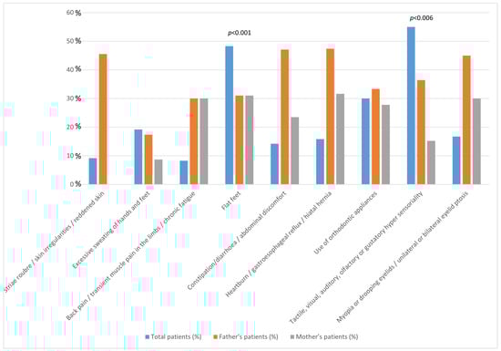 The figure presents the percentage distribution of symptoms among all patients, their fathers, and their mothers. The statistically positive significance of the observed associations is shown.