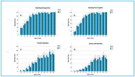 Two-way repeated measure ANOVAs with Tukey HSD post hoc analyses were used to identify significant effects of age and floor surface on standing times. For all SPs, floor surface and age effects were significant (p < 0.001) (Appendix C). Across all ages and SPs, standing times were significantly longer on the FFS than CFS; however, for SLS, there was a significant interaction between floor surface and age (p = 0.006).