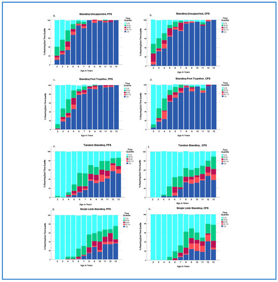 Percentage of Children in Time Quartiles for each SP and Floor Surface by Age Group. Quartiles represent intervals of standing times in seconds (0–29, 30–59, 60–89, 90–119) and those attaining the maximum time of 120 seconds, as these children could potentially have maintained the position longer. (a) Standing Unsupported (SU) on Firm Floor Surface (FFS), (b) SU on Compliant Floor Surface (CFS), (c) Standing Feet Together (SFT) on FFS, (d) SFT on CFS, (e) Tandem Standing (TS) on FFS, (f) TS on CFS, (g) Single-limb Standing (SLS) on FFS, and (h) SLS on CFS.