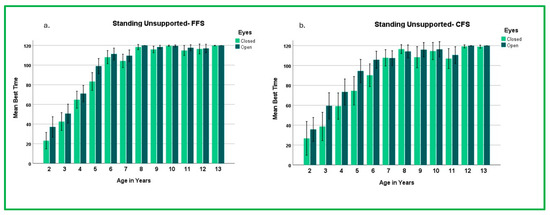Consistent with previous studies, children were able to stand significantly longer when vision was available to them (SU) than when they were blindfolded (SEC) on both the FFS and CFS. This was especially pronounced in the younger age groups. Performance differences in eyes-open and -closed conditions were significant between age groups on the FFS in one-year age increments through 5 years and in two-year age increments through age 7 on the CFS (Figure 3, Appendix E).