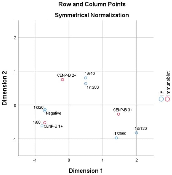A correspondence analysis was conducted to investigate the relationship between IIF dilution levels and immunoblot reactivity within the SARD group dataset. The analysis revealed a statistically significant association between the two variables (χ2 = 31.214, p = 0.002), indicating that dilution levels and immunoblot results were not independent. The analysis identified two dimensions that captured the variance in the data: Dimension 1 accounted for 74.1% of the total variance, representing the primary relationship between higher IIF dilution levels and stronger immunoblot reactivity (CENP-B 3+). Dimension 2 explained an additional 25.9% of the variance, providing further differentiation between the immunoblot categories.