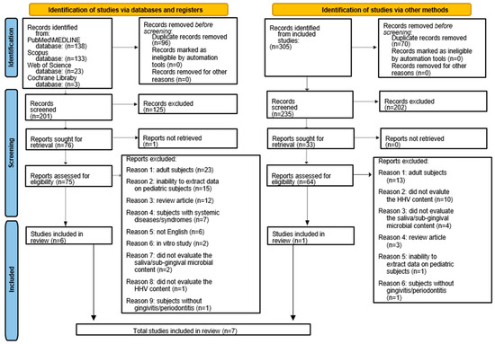 Finally, the present systematic review included seven articles [17,23,24,25,26,27,28] on the microbiological sampling of HHV, fungi, and periodontal pathogens in subgingival and/or saliva testing in pediatric subjects with gingivitis/periodontitis.