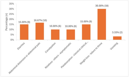 The study included 93 patients distributed in three groups. Group A: 28 newly diagnosed celiac patients (30.1%). Although the planned sample size for the design was 30 patients per group. With the multicenter data collection, 28 patients were recruited in Group A. Of these 28 patients, 25 completed the follow-up. A second citrulline sample was not available for three of them. Group B: 32 celiac patients on a GFD for more than six months (34.4%). Group C: 33 healthy controls (35.5%). The mean age was 8.58 years, with 64.5% being female. Group A participants were significantly younger than those in Group C (p = 0.001) and Group B (p = 0.038). Table 1 summarizes the clinical and laboratory data of the groups. The most common symptom at diagnosis was failure to thrive (30%) (Figure 1), and 92.7% had DQ2-positive genetics.