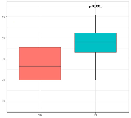 Box Plot. Increase in citrulline levels after a gluten-free diet in patients from Group A. T0: Baseline levels. T1: Levels after 3–6 months on a gluten-free diet. The lower edge of the box represents the first quartile (Q1), the value below which 25% of the data falls. The upper edge of the box represents the third quartile (Q3), the value below which 75% of the data falls. The thick line inside the box represents the median. The whiskers extend from the edges of the box (Q1 and Q3) to the maximum and minimum values.