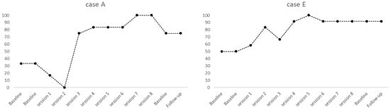 Case C. At baseline, he did not display acquisition, while at post-training 40% of steps. He needed a hand–hand prompt progressively reduced. At half training, the child accepted the toothbrush into the oral cavity by brushing the teeth for the four arches or at the upper and lower incisors. Also, he showed severe impairment (2 SD) in all sensory scales. In the SVAP questionnaire, a slight increase in personal hygiene occurred. Concerning parent inclusion, they prompted the child two times a day using an electric toothbrush. At follow-up, an increase in the frequency of brushing teeth was observed from 1 time to 3 times a day.
