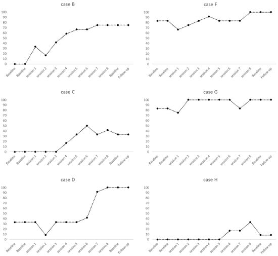 Although only case D reached 100% success using pictograms, the other children started without acquisition, showing higher success in pre- and post-training ratio (A: 30–80%; B: 0–70%; C: 0–40%; D: 30–100%; E: 50–100%; F: 80–100%; G: 80–100%; H: 0–30%). The mean of the group at baseline was 33.7 versus 77.5 at post-training (SD = 33.7; 28.6), and the t-test for two dependent means displayed t = 6.201 with p = 0.000. The maintenance and generalization of self-brushing behavior showed a constant ratio between post-training and follow-up.