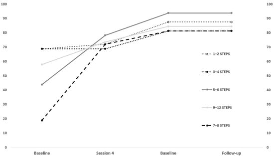 Clinical staff focused on specific behaviors of task analysis that resulted in difficult achievements for children, requiring precise prerequisites related to the composite movements. We reduced the twelve steps of task analysis into five clusters (explained variance = 0.95) as follows: 1–2 = opening the tap water and taking the toothbrush; 3–4 = toothbrush under water, putting on toothpaste; 5–6: brushing teeth on top and down; 7–8: brushing teeth on left and right; 9–12: cleaning the mouth, spitting, closing the tap, and drying mouth. The performances scored 1 for a prompted response and 2 for independent until having a percentage of step acquisition on each data point (Figure 2). At baseline, since the training was in forward chaining (natural sequence), the first four steps (1–4) resulted in more achievement than other clusters, while the others increased during the training. At post-training and follow-up, some clusters, such as brushing teeth left and right (7–8) and spitting (9–12), resulted in more difficulty of achievement, while the steps more easily resulted in brushing teeth on the top and down. Such differences in step acquisition resulted in a significant difference (Chi2 = 31.088; p = 0.001).