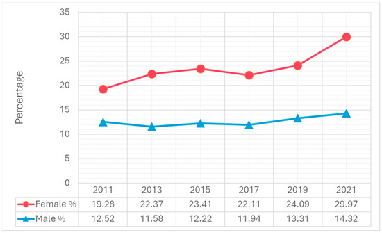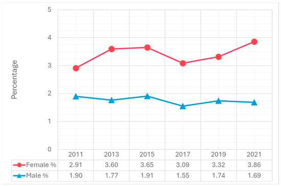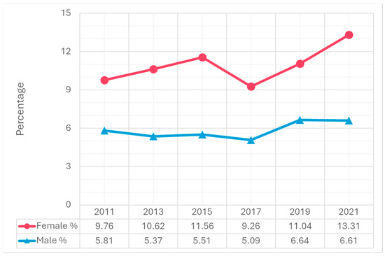 Trend analysis from 2011 to 2021 revealed significant increases in suicidal ideation, particularly among females. The percentage of females who seriously considered suicide increased from 19.3% in 2011 to 30.0% in 2021, compared to a smaller increase among males, from 12.5% to 14.3% (Figure 1). A similar trend was observed in suicide planning. The percentage of females who made suicide plans rose from 14.9% in 2011 to 23.6% in 2021. Among males, the percentage increased slightly from 10.8% in 2011 to 11.6% in 2021 (Figure 2). Attempting suicide among females increased 1.4-fold from 2011 to 2021. Among males, the percentage increased slightly from 5.8% in 2011 to 6.6% in 2021 (Figure 3). The percentage of females who had an injurious suicide attempt also exhibited an overall upward trend from 2.9% in 2011 to 3.9% in 2021, whereas the percentage of males slightly decreased from 1.9% in 2011 to 1.7% in 2021 (Figure 4).