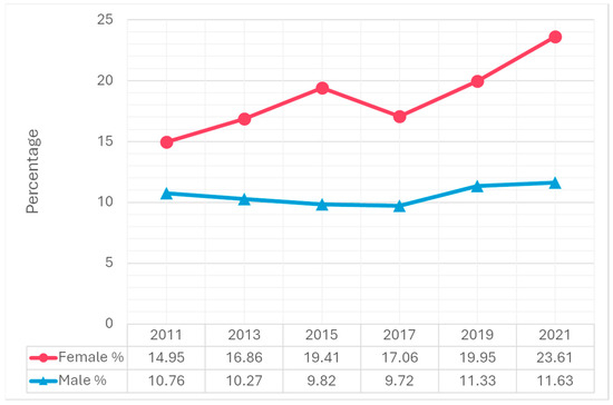 The significant increase in suicidal ideation among females, from 19.3% in 2011 to 30.0% in 2021, suggests that factors such as social pressures, exposure to social media, and pandemic-induced isolation may exacerbate mental health vulnerabilities. Research shows that adolescent females may experience social and academic stressors differently, particularly during adolescence when social comparisons and pressures to conform are heightened [4,11]. Moreover, the COVID-19 pandemic has contributed to a decline in mental health, disproportionately affecting females due to greater social isolation, disrupted support networks, and heightened family responsibilities [12,13].