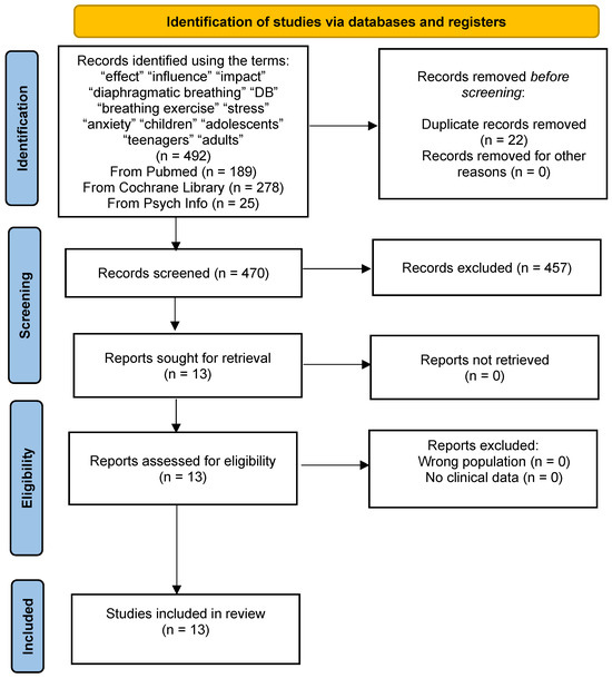 A detailed literature search was conducted in the electronic databases of Pubmed and Cochrane Library to find current studies on the effect of DB as a complementary therapeutic method for dealing with stress in children and adolescents aged 6–18 years. We used keywords for a thorough literature search, which we combined with the Boolean operators “AND”, “OR”, and “NOT”. The search performed in the databases Pubmed, Cochrane Library, and Psych Info in the field “Advanced search” was as follows: (“effect” OR “influence” OR “impact”) AND (‘diaphragmatic breathing’ OR “DB” OR “breathing exercise”) AND (“stress” OR “anxiety”) AND (“children” OR “adolescents” OR “teenagers” NOT “adults”). Also, the filters used were: “studies published from 1 January 2010 to 31 October 2024”, and “English Language”. Duplicates were identified and excluded. Titles and abstracts of articles were independently assessed by all authors to limit bias and errors. Two meetings and discussions were held between the authors to decide on the inclusion and exclusion criteria for the reports.