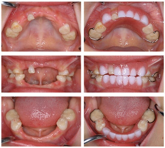 - Akitomo, T.; Kusaka, S.; Iwamoto, Y.; Usuda, M.; Kametani, M.; Asao, Y.; Nakano, M.; Tachikake, M.; Mitsuhata, C.; Nomura, R. Five-Year Follow-Up of a Child with Non-Syndromic Oligodontia from before the Primary Dentition Stage: A Case Report. Children 2023, 10, 717. [Google Scholar] [CrossRef] [PubMed]