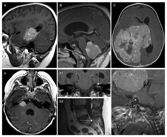 Figure presents all cases with true leptomeningeal dissemination (LMD) at diagnosis. (A) Case of a supratentorial choroid plexus carcinoma with simultaneous LMD in the right cerebellopontine angle (a), which, according to imaging characteristics, is very similar to the tumor and exhibits small cystic components. (B) Case of a purely solid plexus papilloma with also solid LMD in the left internal auditory meatus (arrow in b1) as well at the level S1/2 (arrow in b2). (C) Case of a large supratentorial choroid plexus carcinoma with laminar LMD along the anterior brainstem (arrow in c).
