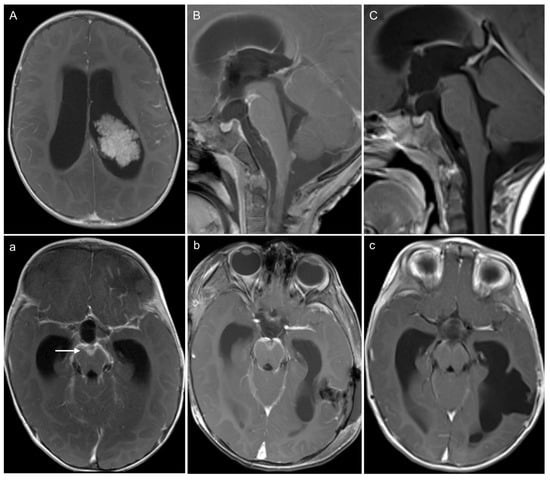 - Scala, M.; Morana, G.; Milanaccio, C.; Pavanello, M.; Nozza, P.; Garrè, M.L. Atypical Choroid Plexus Papilloma: Spontaneous Resolution of Diffuse Leptomeningeal Contrast Enhancement after Primary Tumor Removal in 2 Pediatric Cases. J. Neurosurg. Pediatr. 2017, 20, 284–288. [Google Scholar] [CrossRef]