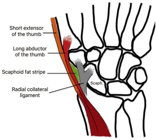 - Corfitsen, M.; Christensen, S.E.; Cetti, R. The anatomical fat pad and the radiological “scaphoid fat stripe”. J. Hand Surg. Br. 1989, 14, 326–328. [Google Scholar] [CrossRef] [PubMed]