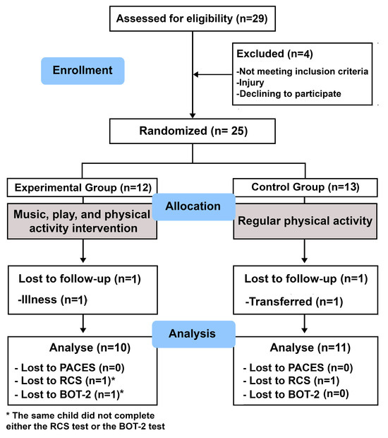 Flow diagram. Experimental design: PACES, Physical Activity Enjoyment Scale; RCS, Response to Challenge Scale; BOT-2, Bruininks–Oseretsky Motor Performance Test.