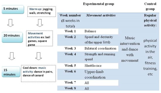 An intervention with an experimental group was used to investigate the effects of 8 weeks of physical activity, including movement and musical activities, on motor skills, social interactions, and qualitative characteristics. Twenty-four training sessions of 45 min were carried out over eight weeks, 3 times a week. This program consisted of three parts: (1) warm-up; (2) movement activities; and (3) musical activities. Each session included 5 min of warm-up, followed by 3 min of recovery after warm-up, 20 min of movement activities, and, finally, 15 min of musical activities. The training protocols of the experimental group are detailed in Figure 2.