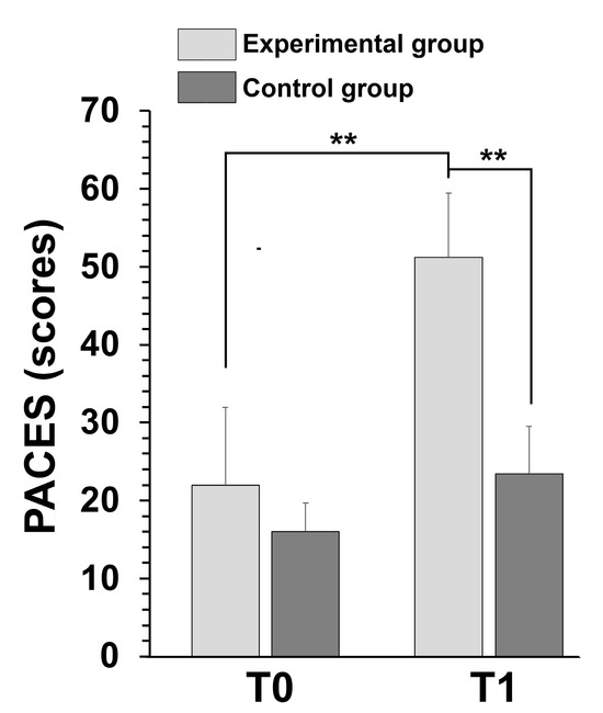 PA enjoyment was assessed using the PACES. Statistical analysis revealed a greater group effect (p = 0.004) and time effect (p = 0.002) in the experimental group compared to the control group. A significant interaction between group and time was observed (p = 0.005), with raw scores improving in both experimental conditions. After 8 weeks of intervention and rehabilitation, PACES scores were very high in the experimental group compared to the control group (p = 0.001). Similarly, scores improved significantly in the experimental group post-intervention (p = 0.002) (Figure 3).