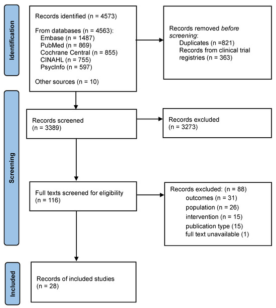 There were 3389 unique records, of which 116 full texts were assessed for eligibility (Figure 1). Included in the review were 28 papers, reporting 26 studies (2 studies appearing in 2 papers each [31,32,33,34]).