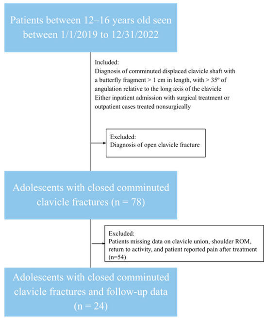 Inclusion criteria included: patients 12 to 16 years of age, seen at the center between 1 January 2019 and 31 December 2022, diagnosis of a comminuted displaced clavicle shaft with a butterfly fragment more than 1cm in length, with >35 degrees of angulation relative to the long axis of the clavicle, in-patient admission with surgical treatment, and out-patient cases treated non-surgically. Excluded patients included those younger than 12 years of age and older than 16 years of age, and those with open clavicle fractures.
