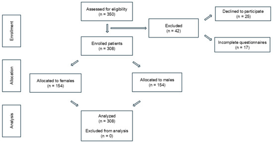 Participants were eligible if they were enrolled at Vinga Technological High School, aged 15–18 years and provided written informed consent. A total of 350 students were assessed; 42 were excluded—25 declined participation and 17 submitted incomplete questionnaires. The final sample included 308 students who met the criteria and completed the survey. Exclusion criteria included incomplete key sections of the questionnaire or cognitive impairments that might hinder independent understanding of survey items. A flow diagram summarizing the enrollment and analysis process is shown in Figure 1.