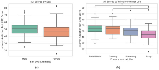 Distribution of IAT scores among Romanian high school students. (a) IAT scores by sex. Male students reported significantly higher scores than female students (p < 0.001). (b) IAT scores by primary internet use. Students who mainly used the internet for social media (** p < 0.01) or gaming (* p < 0.05) had significantly higher scores than those who used it for studying.