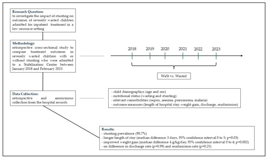 This retrospective cross-sectional study compared treatment outcomes in severely wasted children with or without stunting who were admitted to the nutritional rehabilitation unit of the St. Luke Wolisso Hospital (Wolisso, Ethiopia) between January 2018 and February 2023. The reporting followed the EQUATOR STROBE checklist (Supplementary Materials) [22].