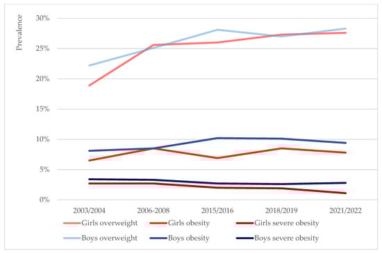 Finally, severe obesity was again more common in boys (2.9%) than girls (2.0%) for the duration of the study. In girls, it was generally downtrending or stable: 2.7%, 2.7%, 2.0%, 1.9% and 1.1% in 2003/2004, 2006–2008, 2015/2016, 2018/2019 and 2021/2022, respectively (Figure 1). In boys, the prevalence was downtrending in all but the very last round of measurement: 3.4%, 3.3%, 2.7%, 2.6% and 2.8%, respectively. The observed changes in neither sex were, however, statistically significant (p = 0.781 for boys, p = 0.082 for girls).