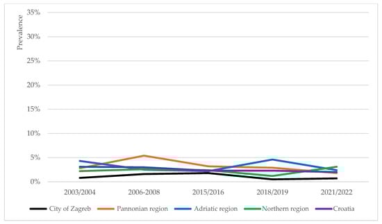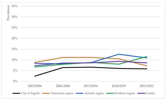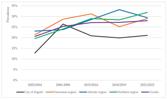 The prevalence trends of overweight, obesity and severe obesity in school-aged children were analysed for four NUTS-2 regions in Croatia [31]: the Pannonian, Northern and Adriatic regions of Croatia, and the City of Zagreb. At the regional level, the prevalence trends of overweight (including obesity), obesity and severe obesity were of heterogenous nature (Figure 2, Figure 3 and Figure 4).