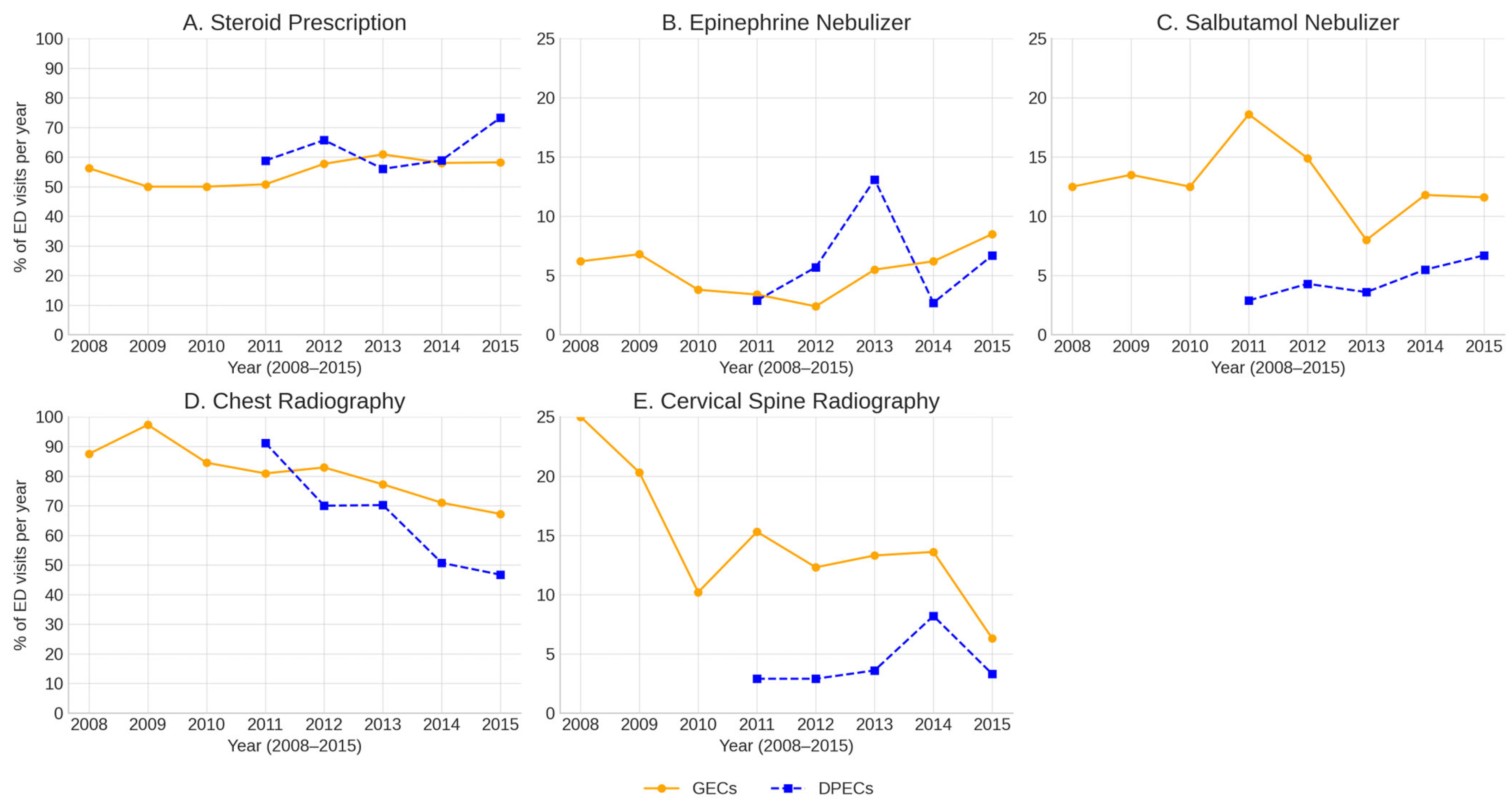 - Dedicated pediatric emergency centers (DPECs) were associated with lower use of potentially low-value interventions (salbutamol and chest and cervical radiography) than general emergency centers (GECs).