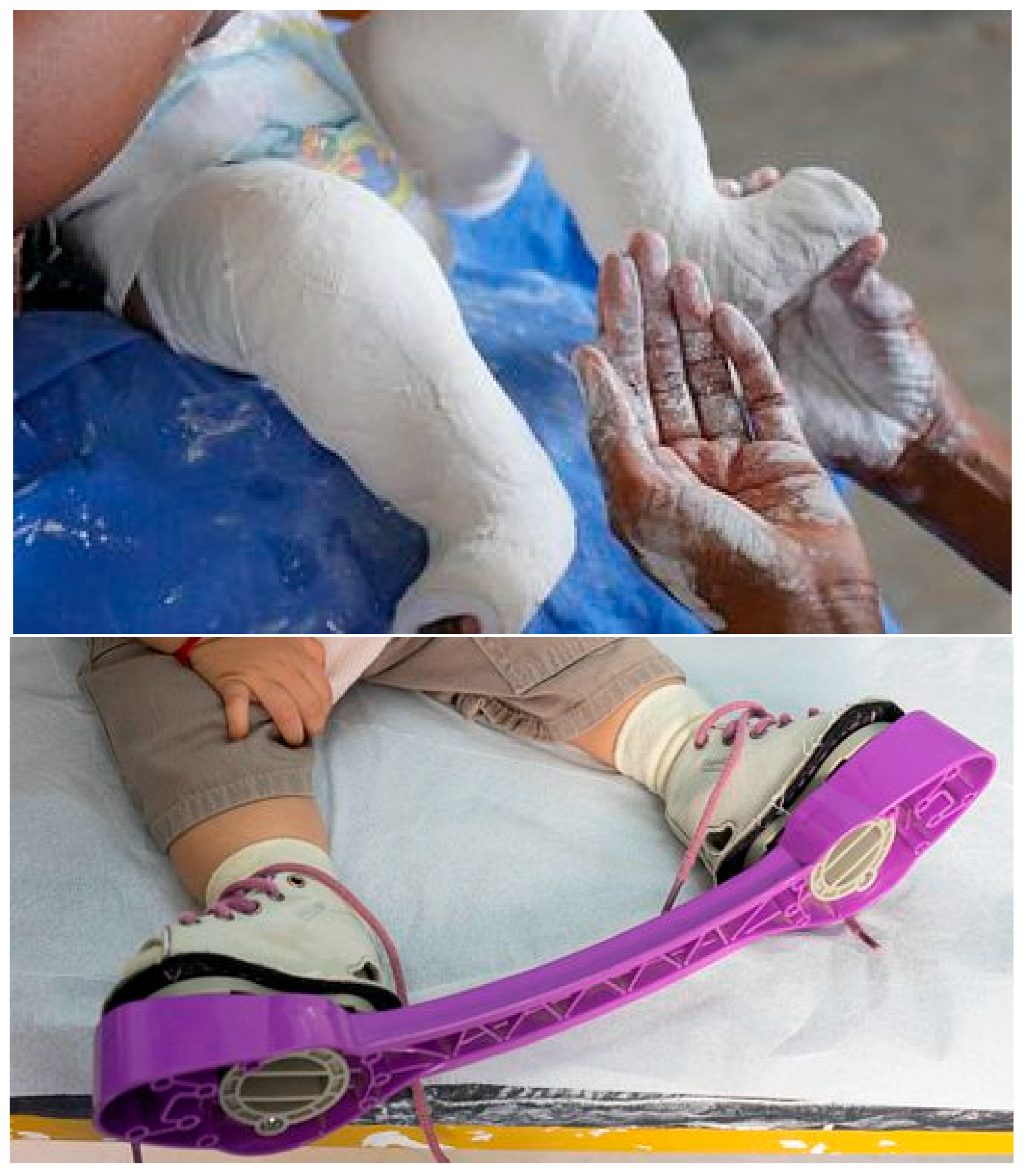 Figure 2 (top), to manipulate the foot and slowly bring it back to its correct position. The casting process typically spans 5 to 7 weeks, during which a pediatric orthopedic surgeon performs weekly manipulations of the foot following the Ponseti method. At the same time, a specialist, such as a nurse practitioner, applies the cast.