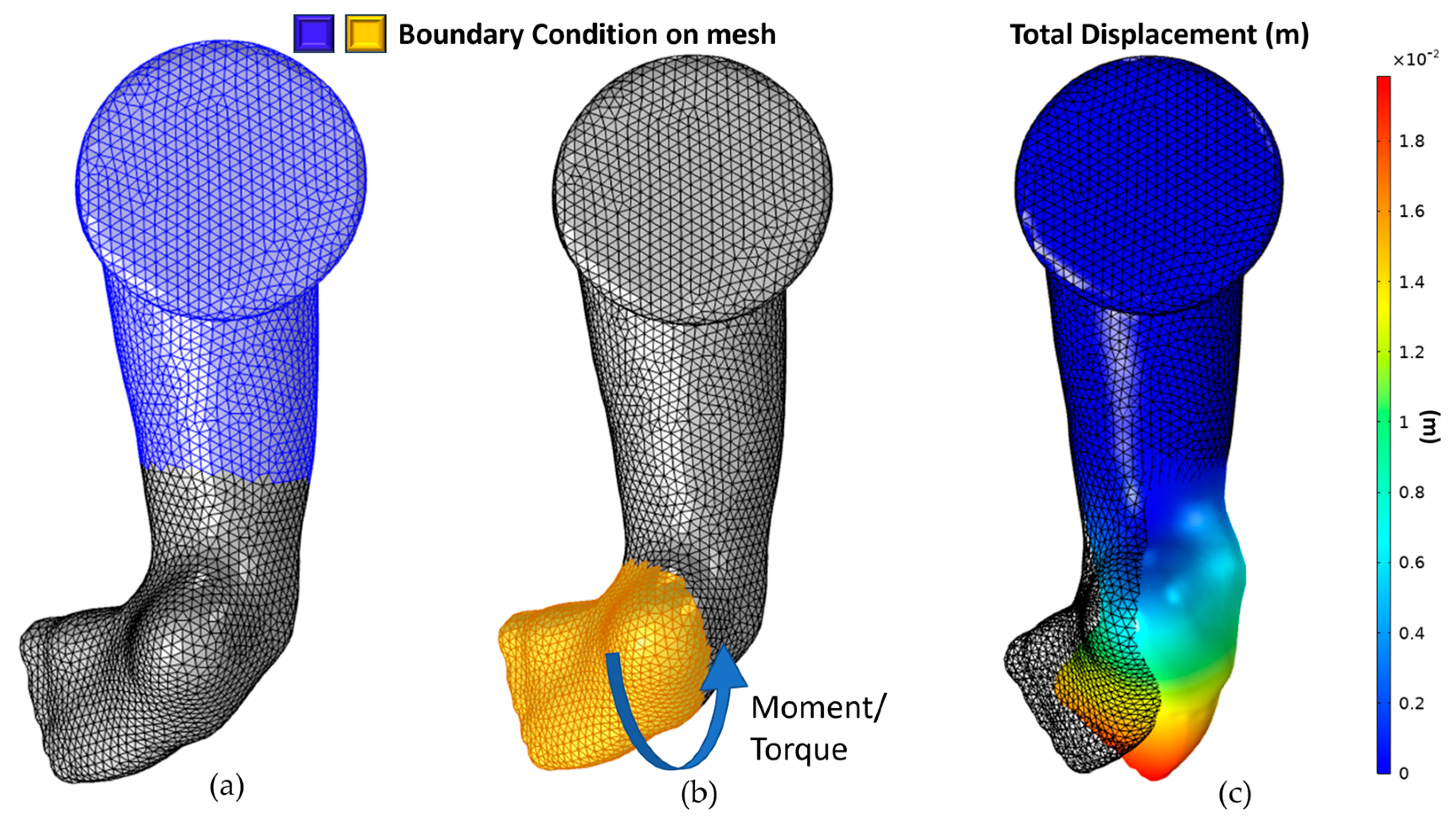 After preprocessing the model, boundary conditions were applied. The zero-displacement condition was applied to the upper ankle/tibia region to mimic the leg being held stationary during casting. Two different boundary conditions were used to manipulate the part of the model that needed to be corrected: a boundary condition to apply a 3D force with x, y, and z components, and a boundary condition to hold the upper foot while applying a 3D torque/moment to rotate the affected part of the model. These conditions are discussed in more detail in the following sections.