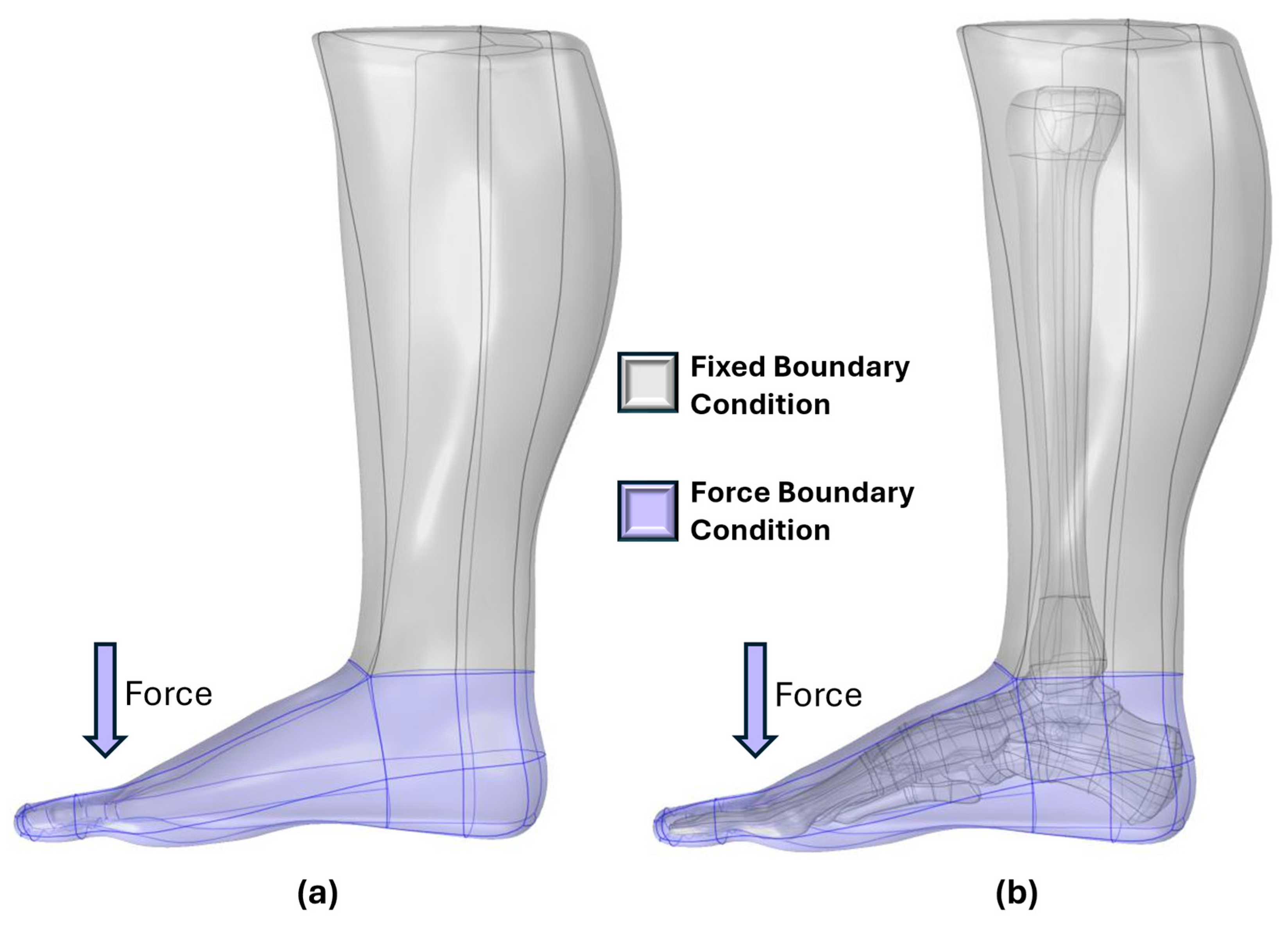 Foot model without bony structure (a), Foot model with bony structure (b).