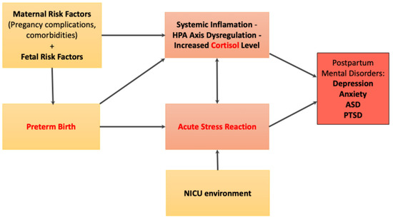 Based on the existing literature [2,5,11,15,24,31,32], we propose the following conceptual model, as illustrated in Figure 1. Maternal and fetal risk factors predispose to preterm birth. Preterm delivery contributes to systemic inflammation through HPA axis dysregulation and elevated cortisol levels. In combination with the stress associated with the NICU environment, these biological and psychosocial factors can trigger an acute stress reaction, thereby increasing the risk of postpartum mental health disorders (Figure 1).