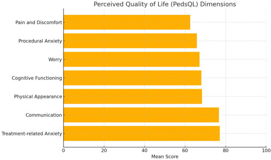Pediatric Quality of Life Inventory (PedsQL—Cancer Module): An internationally validated instrument comprising 27 items organized across multiple dimensions, including pain, nausea, procedural anxiety, treatment-related anxiety, cognitive difficulties, perceived physical appearance, and communication [11]. Scores were converted to a scale from 0 to 100, with higher values indicating a better perceived quality of life. In the present sample, internal consistency was excellent (Cronbach’s α = 0.94).