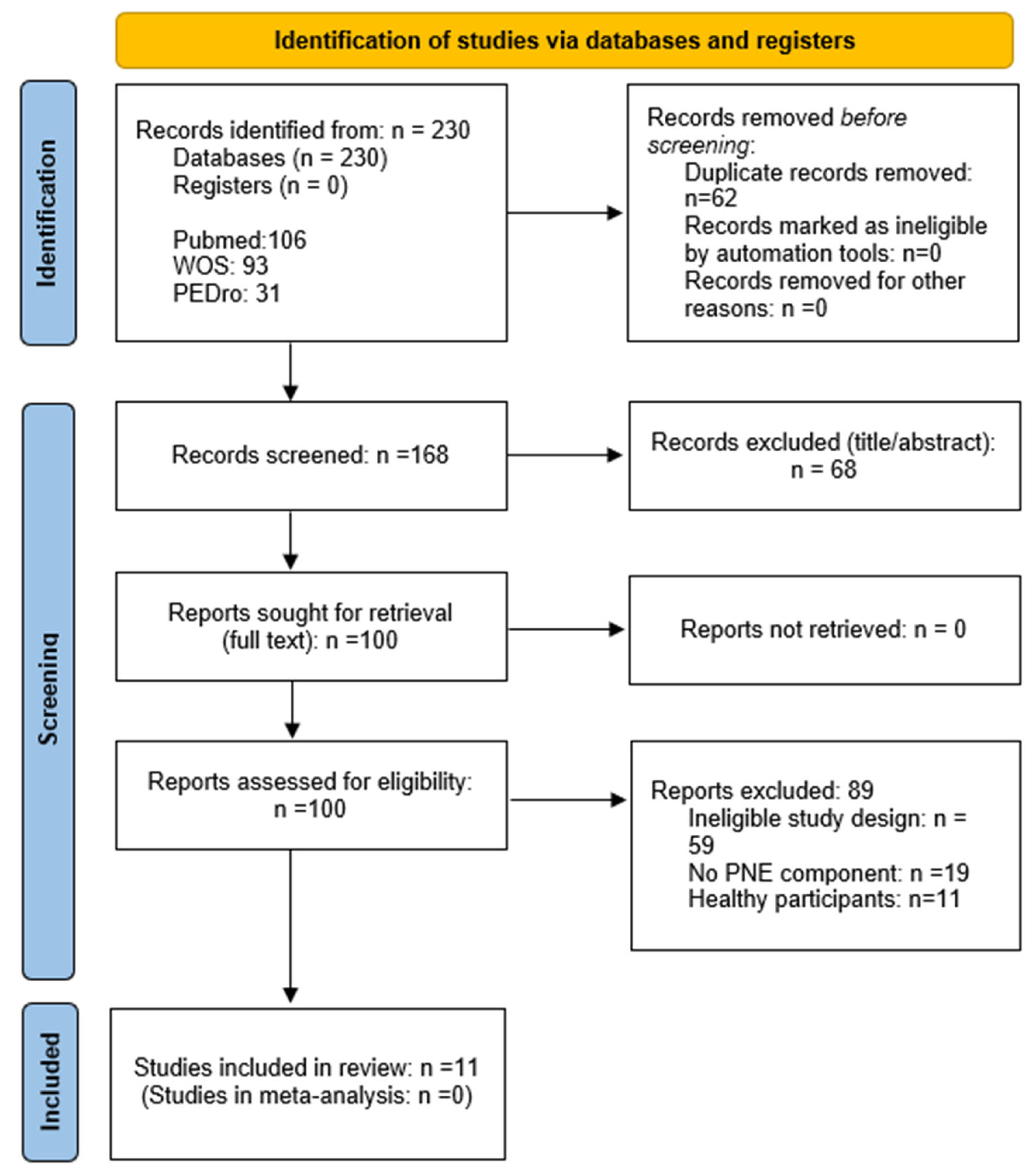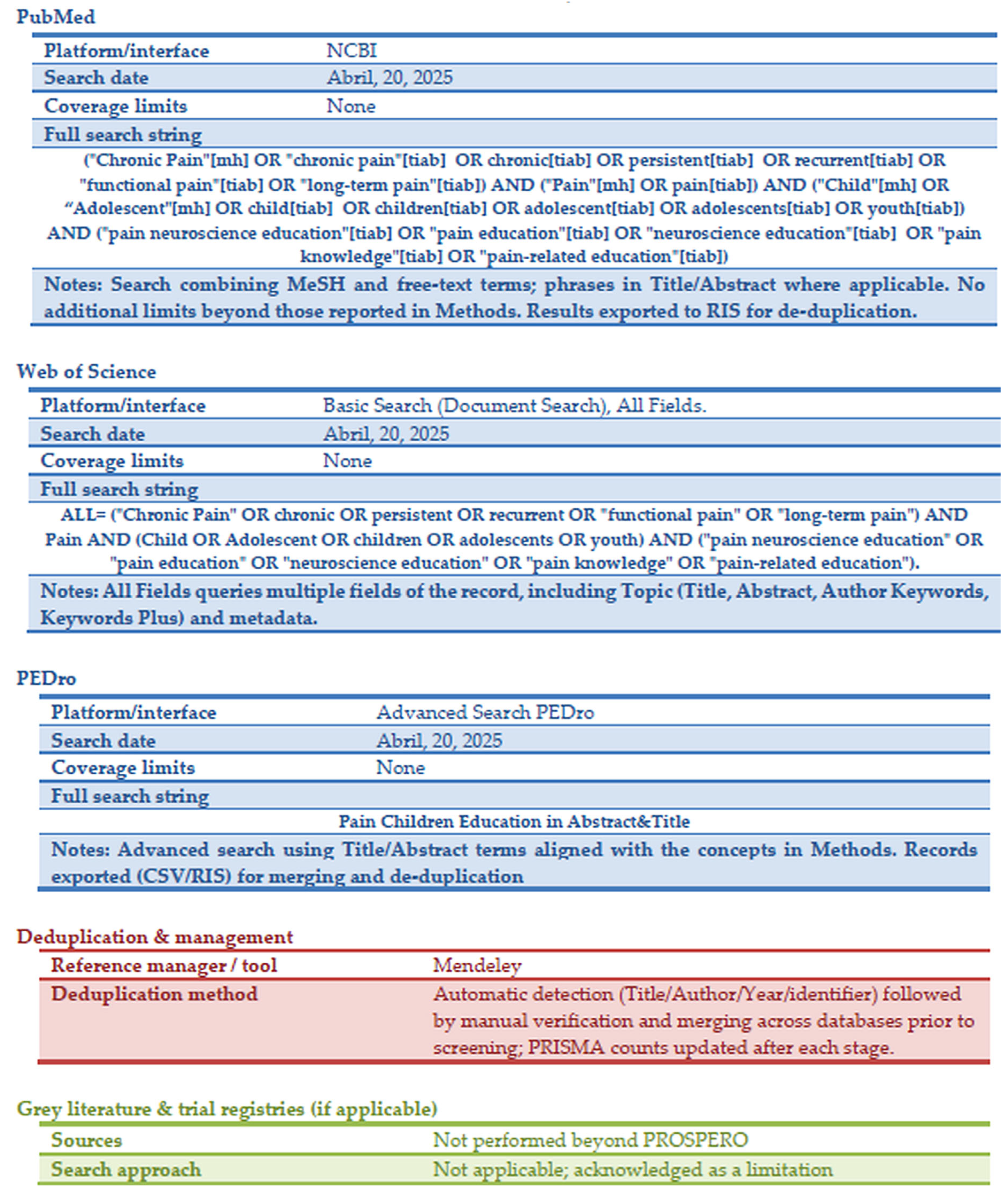 Methods | 6 | Information sources—describe all sources (databases, registers, other), dates of last search. | Section 2.3 Design and Search Strategy (PubMed, WOS, PEDro; last search 21 July 2025); 2.4 Data Extraction | |
