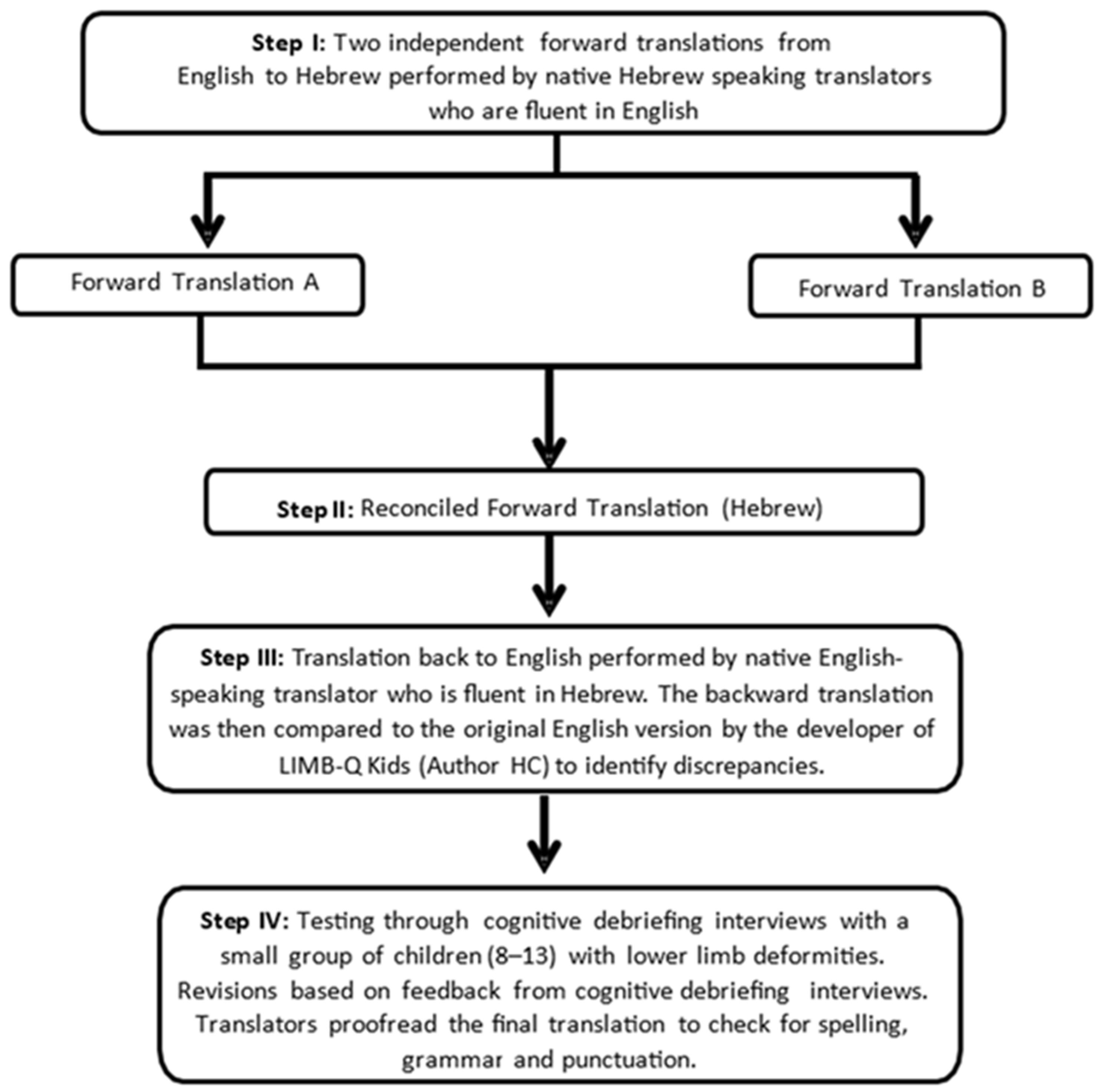 APA StyleEylon, S., Lieberman, M., Brandes, G., Weiss, P. L., Goldman, V., Cooper, A. P., & Chhina, H. (2025). Unique Challenges of Hebrew Translation and Cross-Cultural Adaptation of LIMB-Q Kids for Children with Lower Limb Differences. Children, 12(10), 1318. https://doi.org/10.3390/children12101318