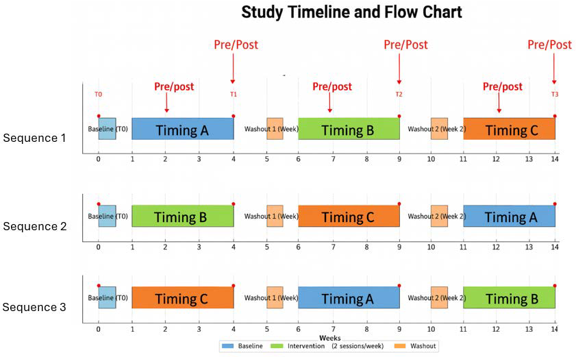 This investigation adopted an experimental crossover design with three timing conditions, conducted in lower secondary schools with students aged twelve to thirteen years. Each participating class was randomly assigned to a different sequence of intervention timings, ensuring a balanced distribution across the three conditions. The study examined the effects of school-based physical activity delivered at three distinct circadian phases: early morning (Timing A 08:10–09:10, during the first lesson), midday (Timing B 12:10–13:10, corresponding to the fifth lesson), and afternoon (Timing C 15:10–16:10, within the extended school schedule). Each condition lasted four consecutive weeks, and during each phase students engaged in two sessions per week of structured physical activity, for a total of eight sessions per condition. To reduce the likelihood of carry-over effects between conditions, a one-week washout period without the experimental intervention was scheduled between phases, during which pupils continued with their regular physical education classes.