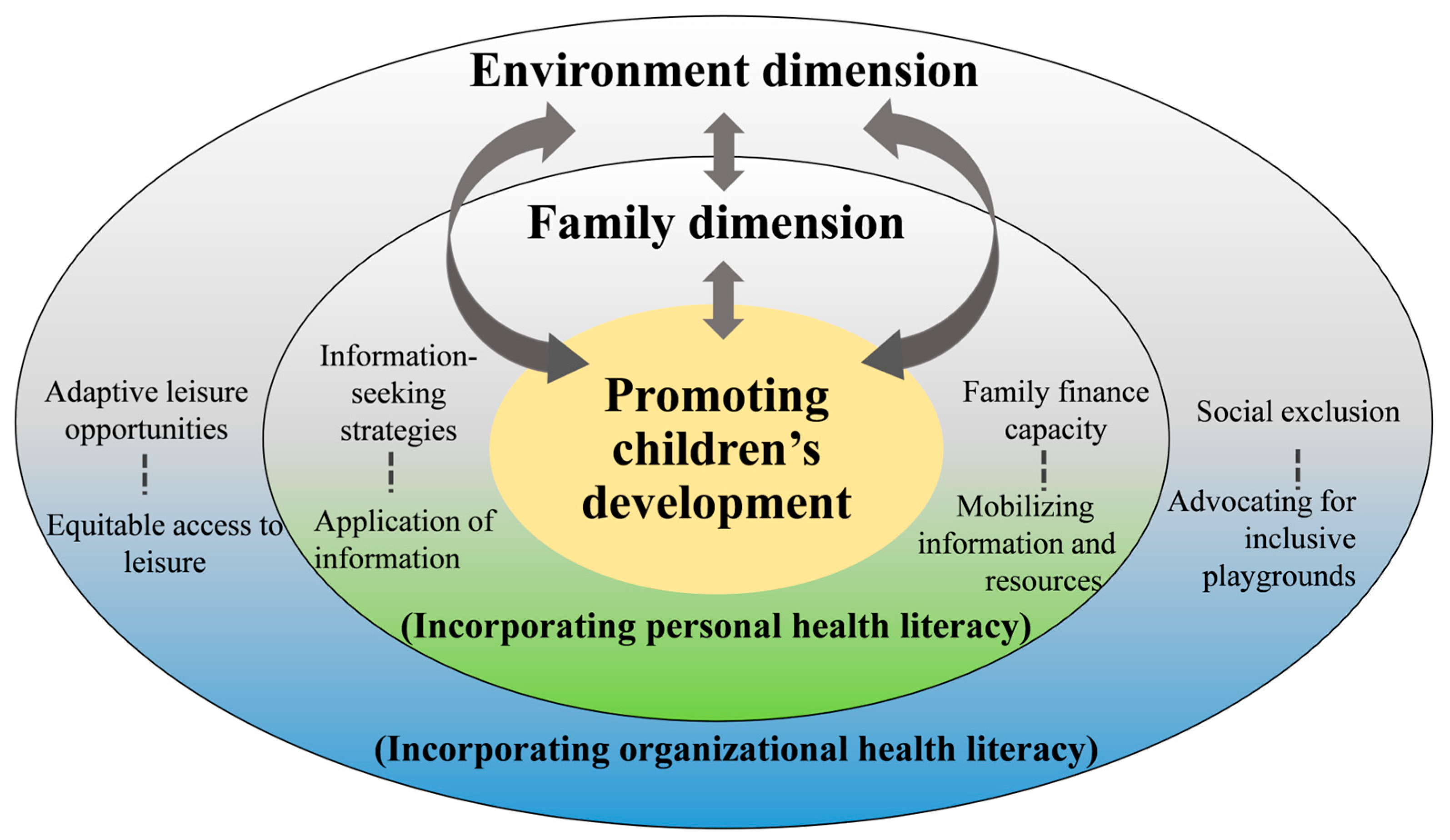 Figure 2, the conceptual model highlights how family strategies (personal health literacy) and environmental conditions (organizational health literacy) interact dynamically. Leisure participation emerges as a cross-cutting process that both shapes and is shaped by family and community contexts, creating iterative cycles of developmental opportunities.