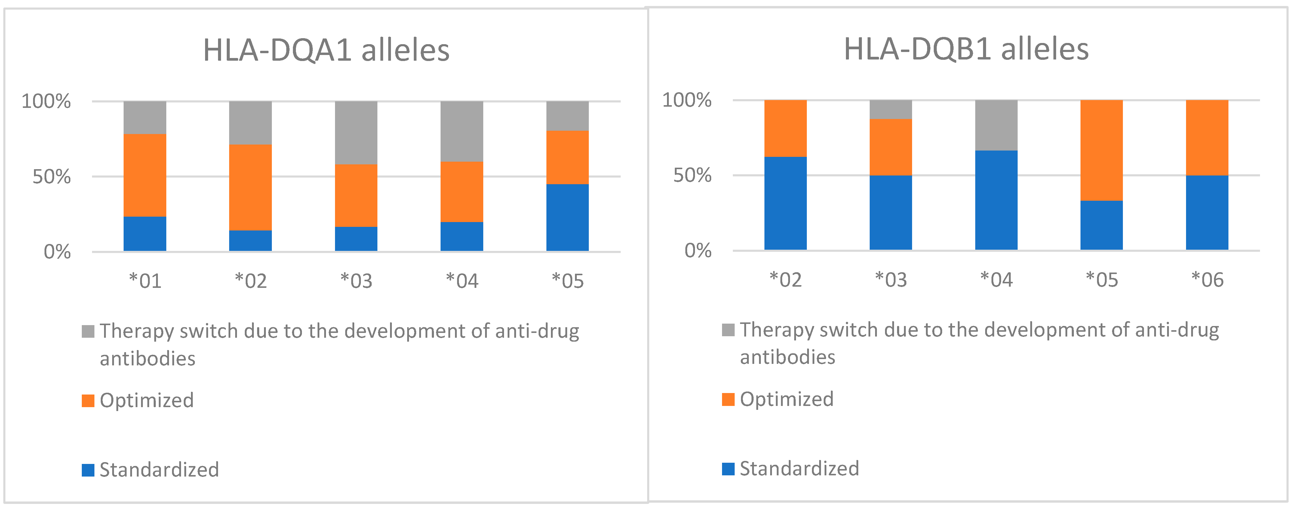 - Sazonovs, A.; Kennedy, N.A.; Moutsianas, L.; Heap, G.A.; Rice, D.L.; Reppell, M.; Bewshea, C.M.; Chanchlani, N.; Walker, G.J.; Perry, M.H.; et al. HLA-DQA1*05 Carriage Associated with Development of Anti-Drug Antibodies to Infliximab and Adalimumab in Patients with Crohn’s Disease. Gastroenterology 2020, 158, 189–199. [Google Scholar] [CrossRef]